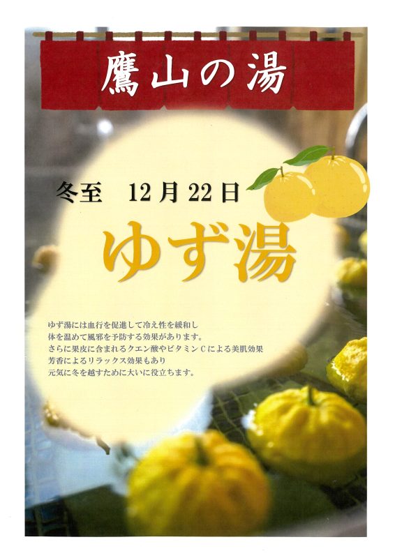 12月22日の冬至は、ゆず湯を開催します。